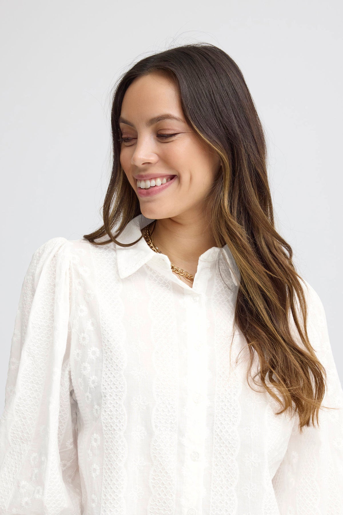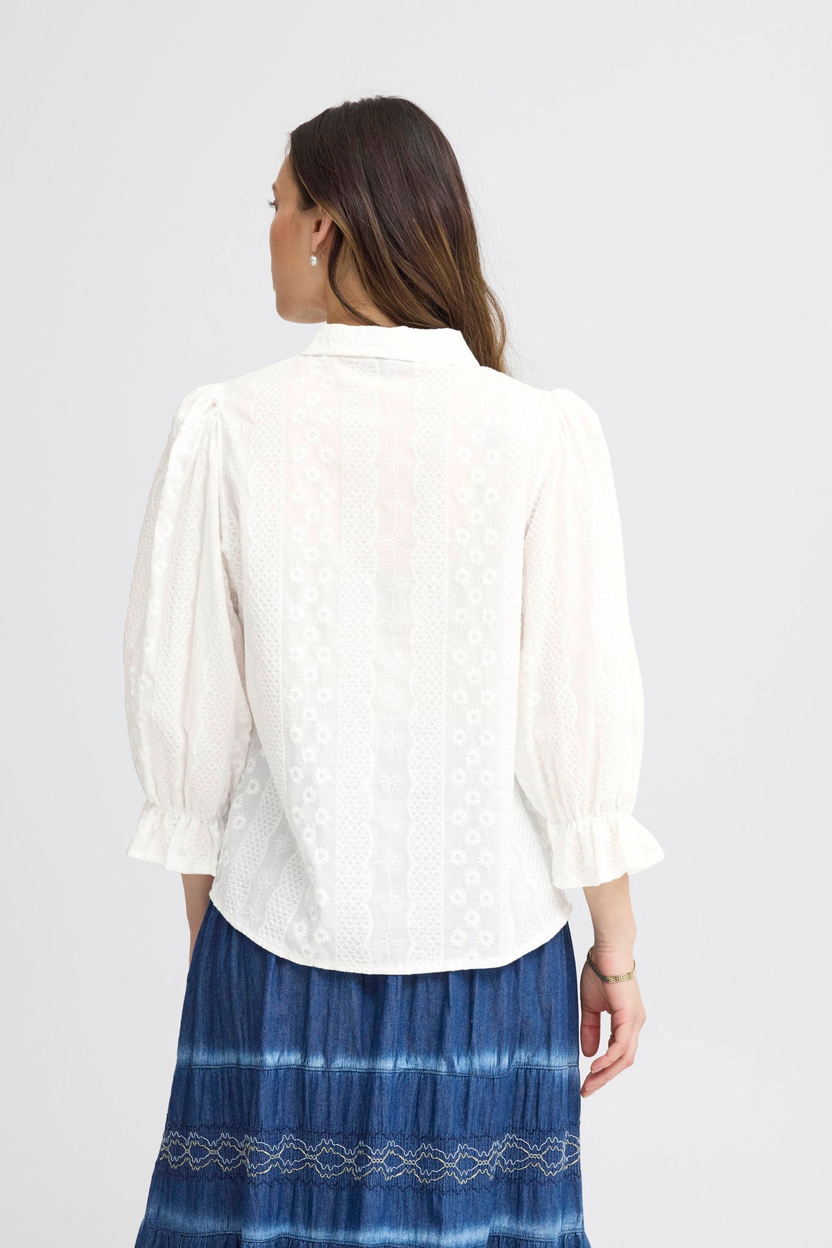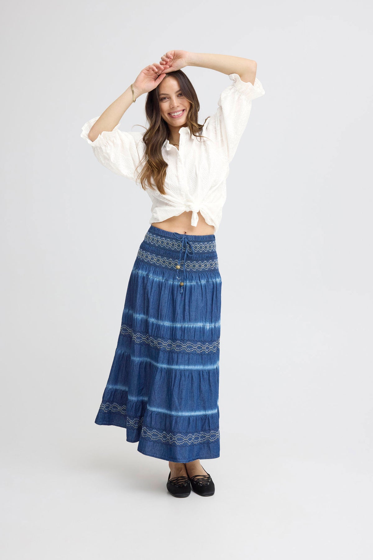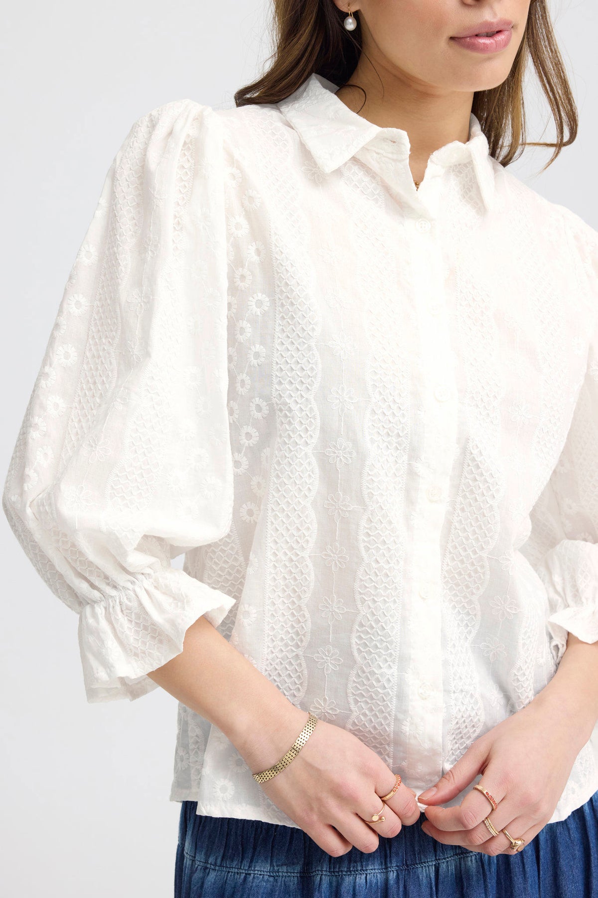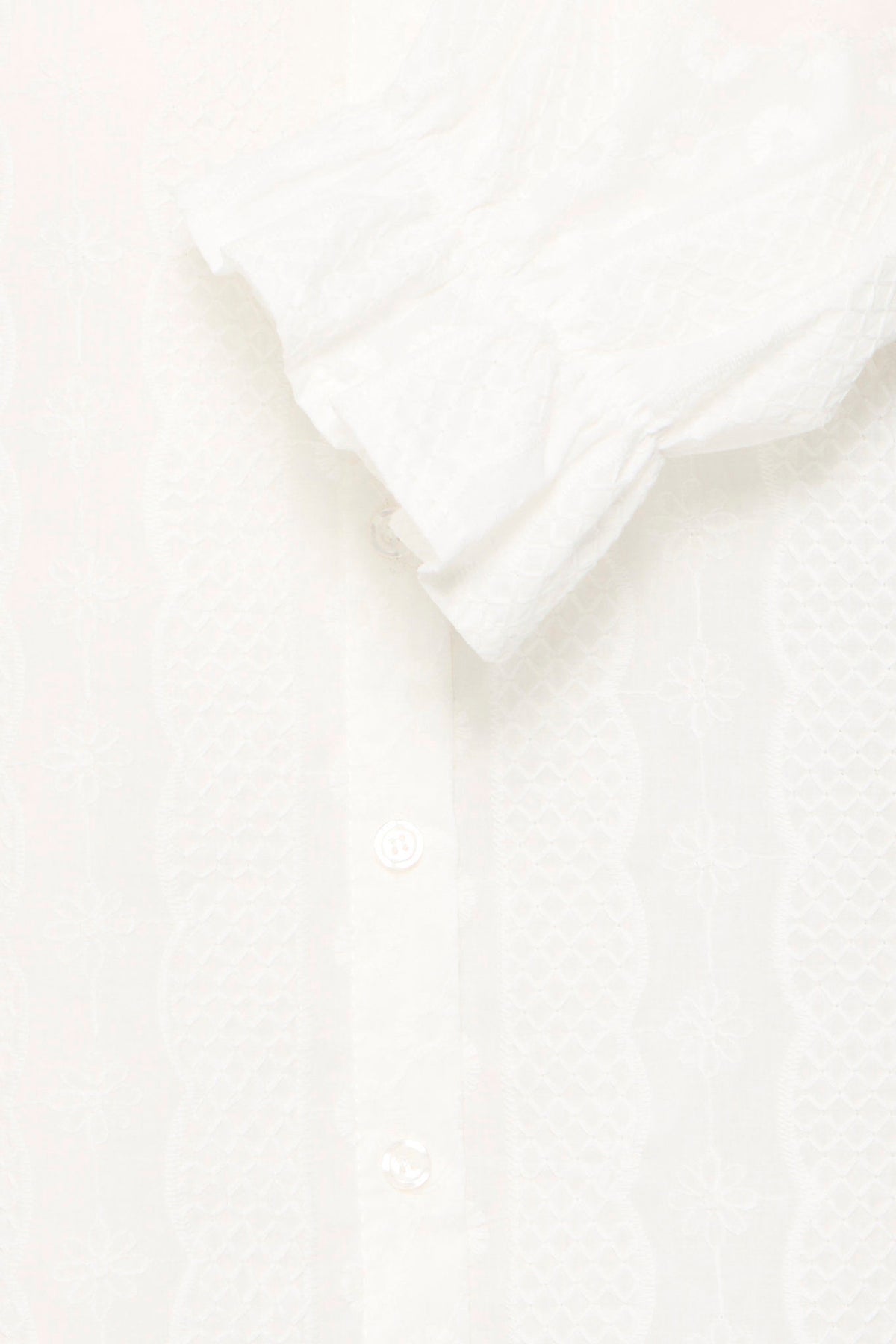 Skjorten har lange ermer med lett puffet stil, som gir et moderne preg. Knytedetaljen i fronten lar deg justere passformen etter ønske. Det dekorative mønsteret på stoffet tilfører et kreativt uttrykk til det rene designet.