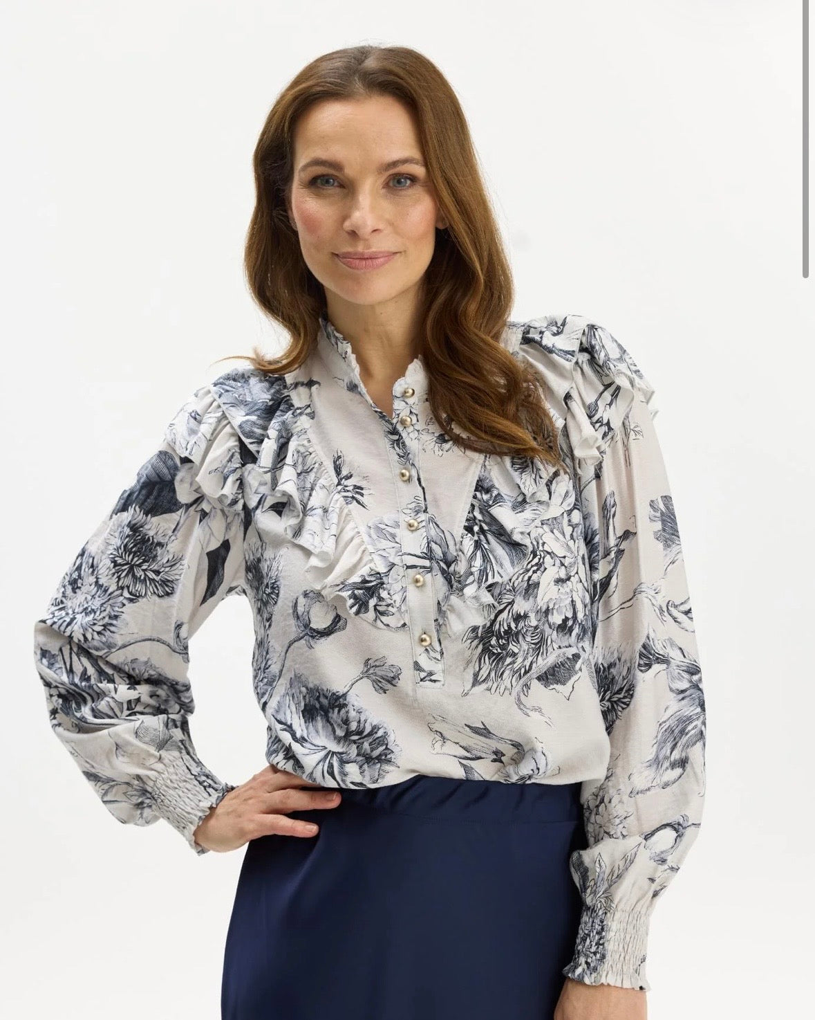 Kvinne i bluse med sort-hvitt blomstertrykk, volanger og perleaktige knapper, smiler med hånden på hoften.