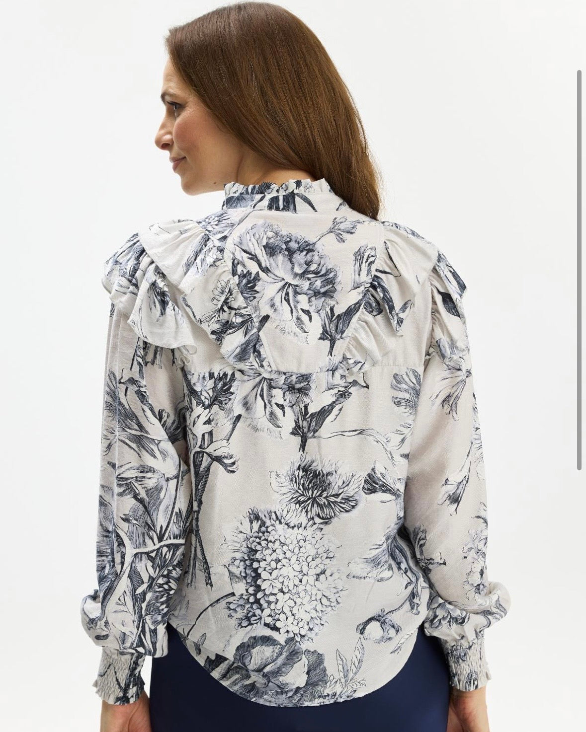Kvinne med bluse med sort-hvitt blomstertrykk, volanger og perleaktige knapper.