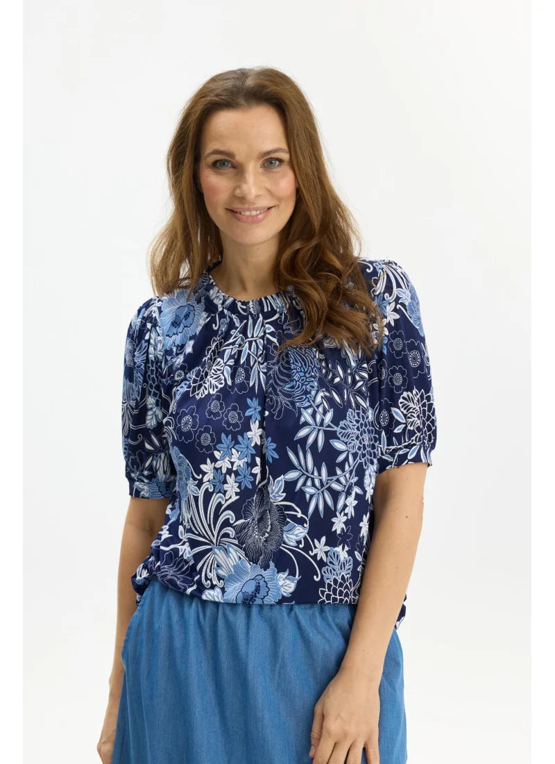 Kvinne iført Grazia Bluse med blått og hvitt blomsterdesign, korte puffermer, rund hals med folder.