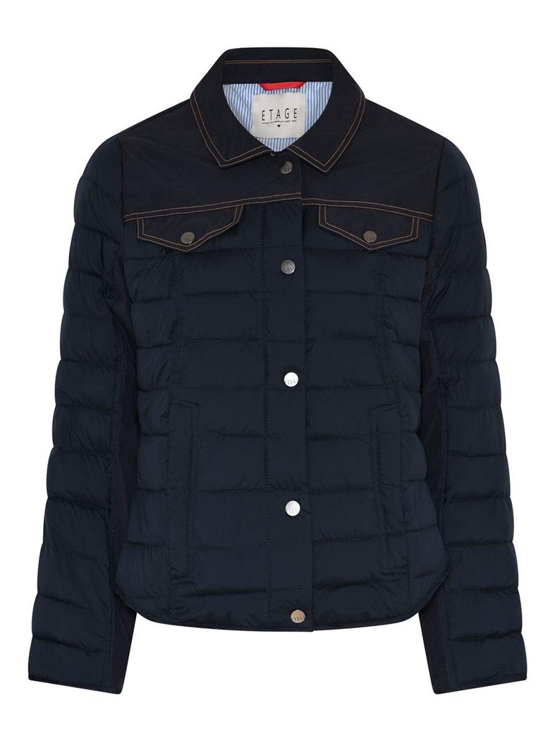 Vattert Kort Jakke fra Etage kombinerer mykt og slitesterkt materiale med moderne design. Kontraststykket over brystet og skuldrene gir jakken et distinkt utseende, mens de to brystlommene med klaff sørger for praktisk oppbevaring. Med en lengde på 62 cm passer den godt til overgangsperioder.