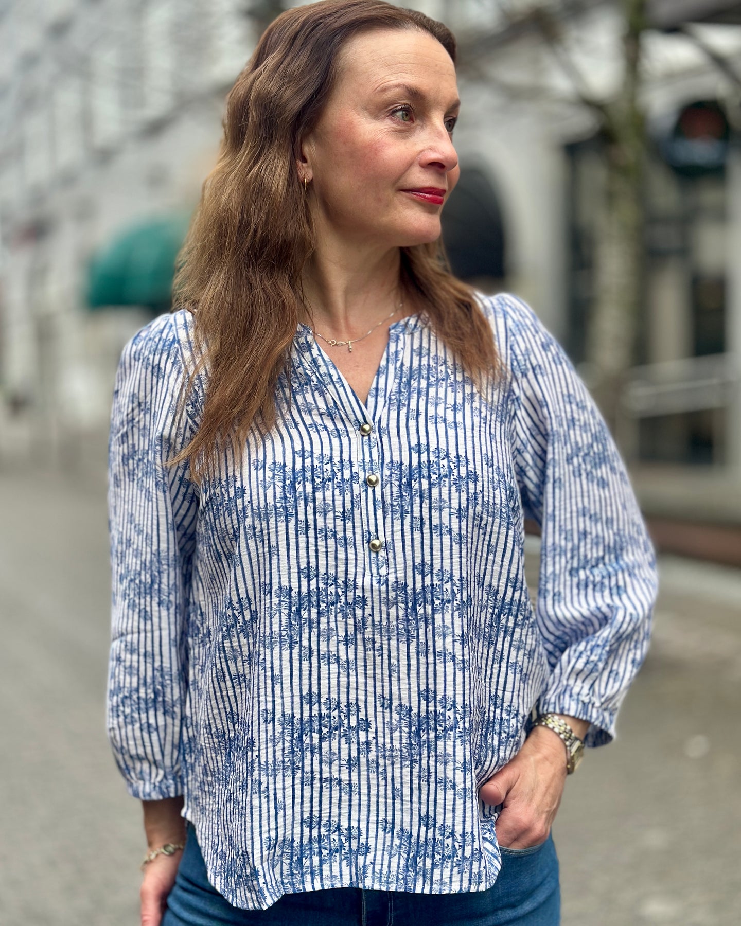 Kvinne med bluse i blå striper og blomster, V-hals med knapper, trekvart ermer, ute i bymiljø.