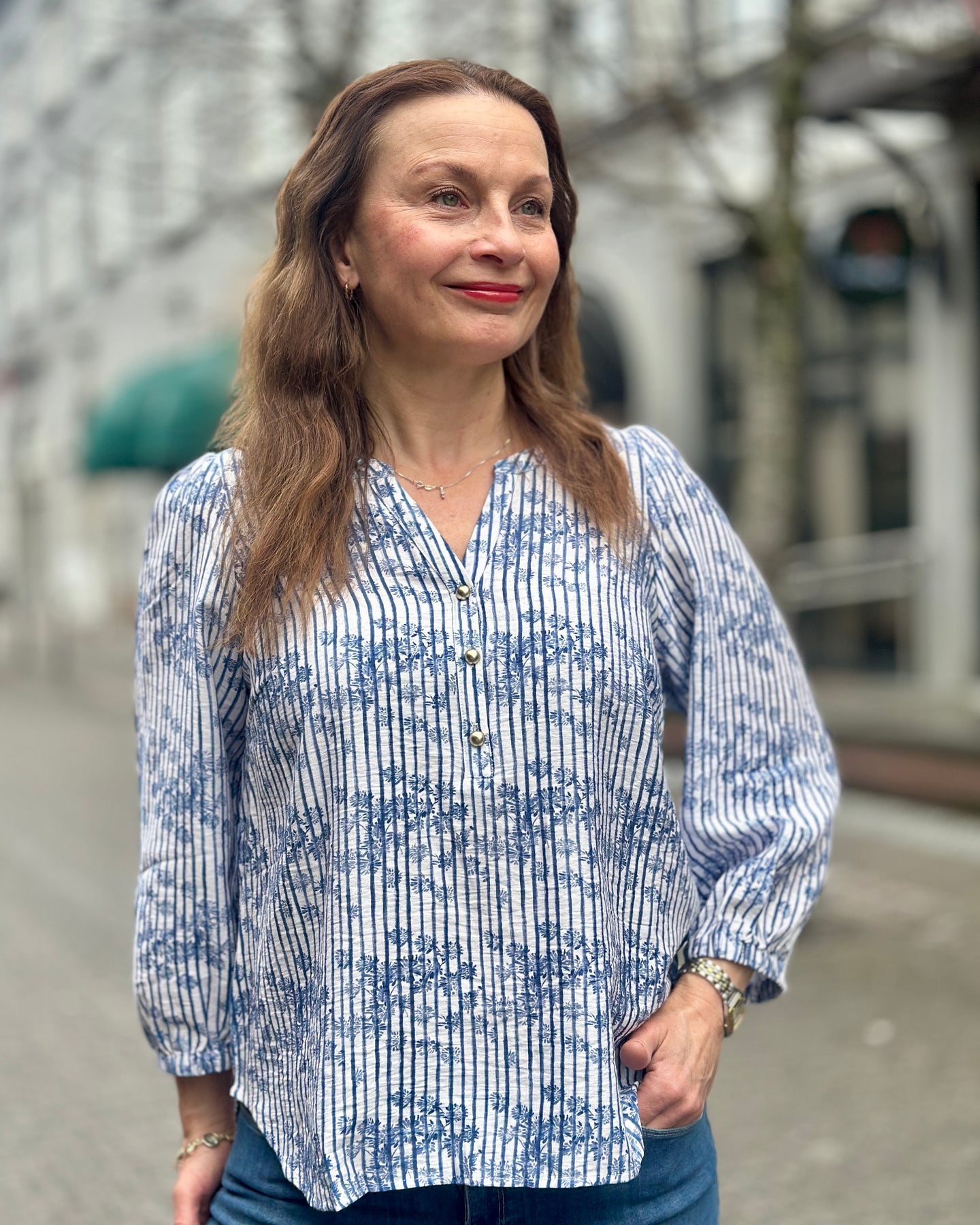 Kvinne i bluse med blått stripemønster og blomster, V-hals og trekvart ermer. Hun smiler.