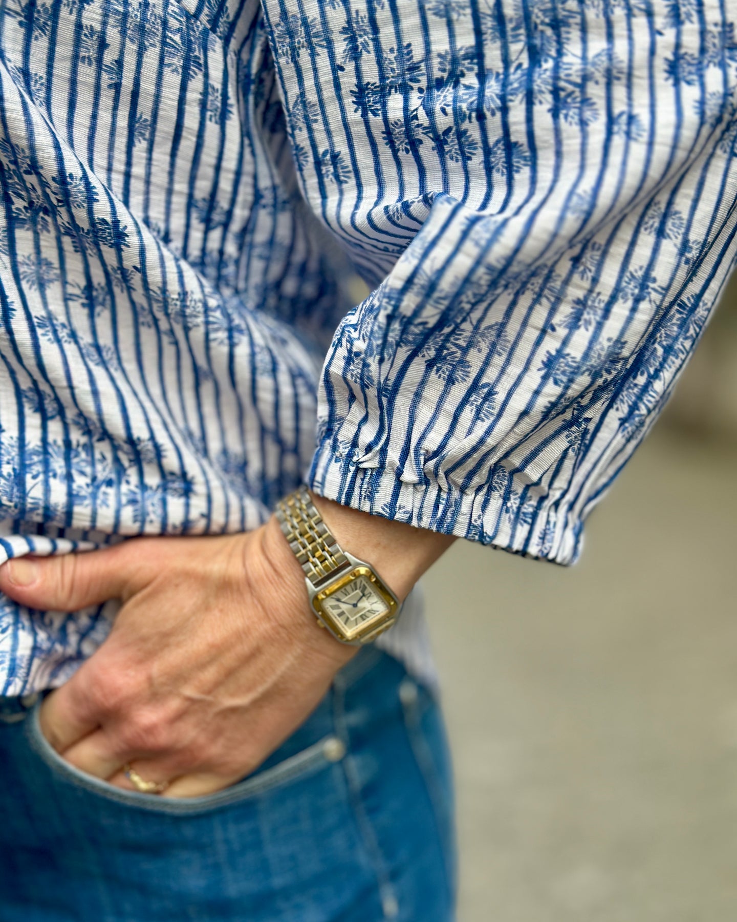 Bluse med blå striper og blomster, trekvart ermer. Gullklokke og hånd i lommen på jeans.