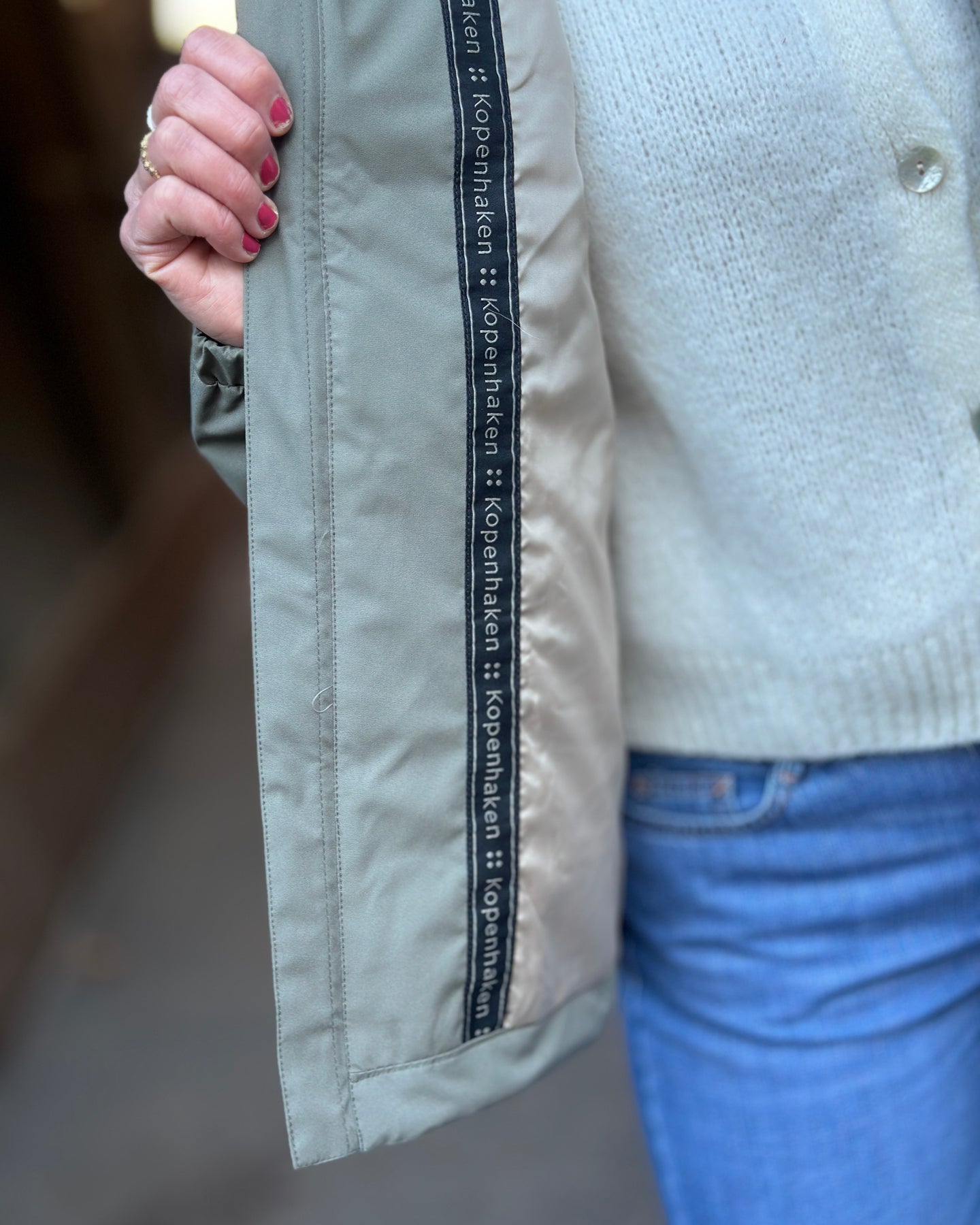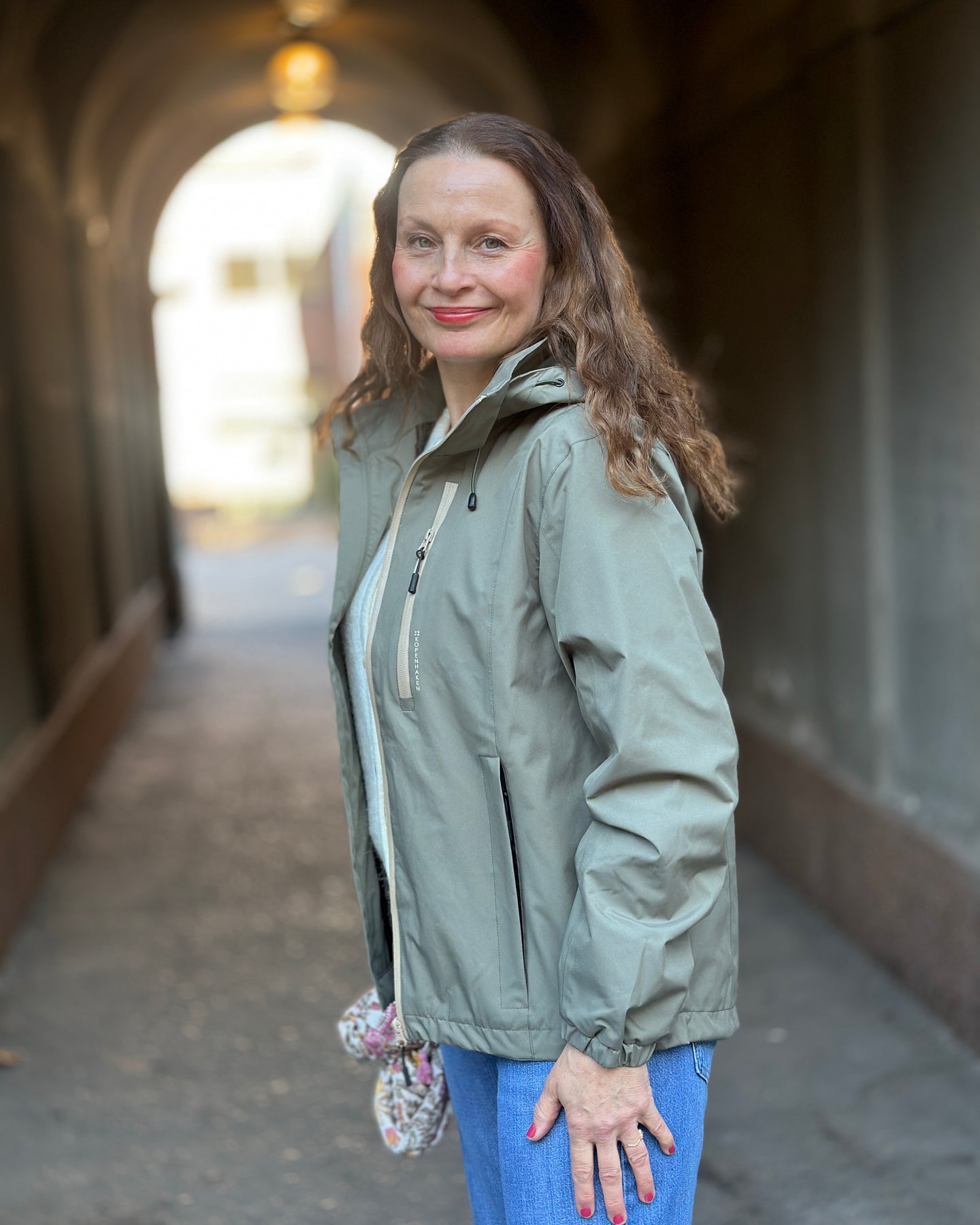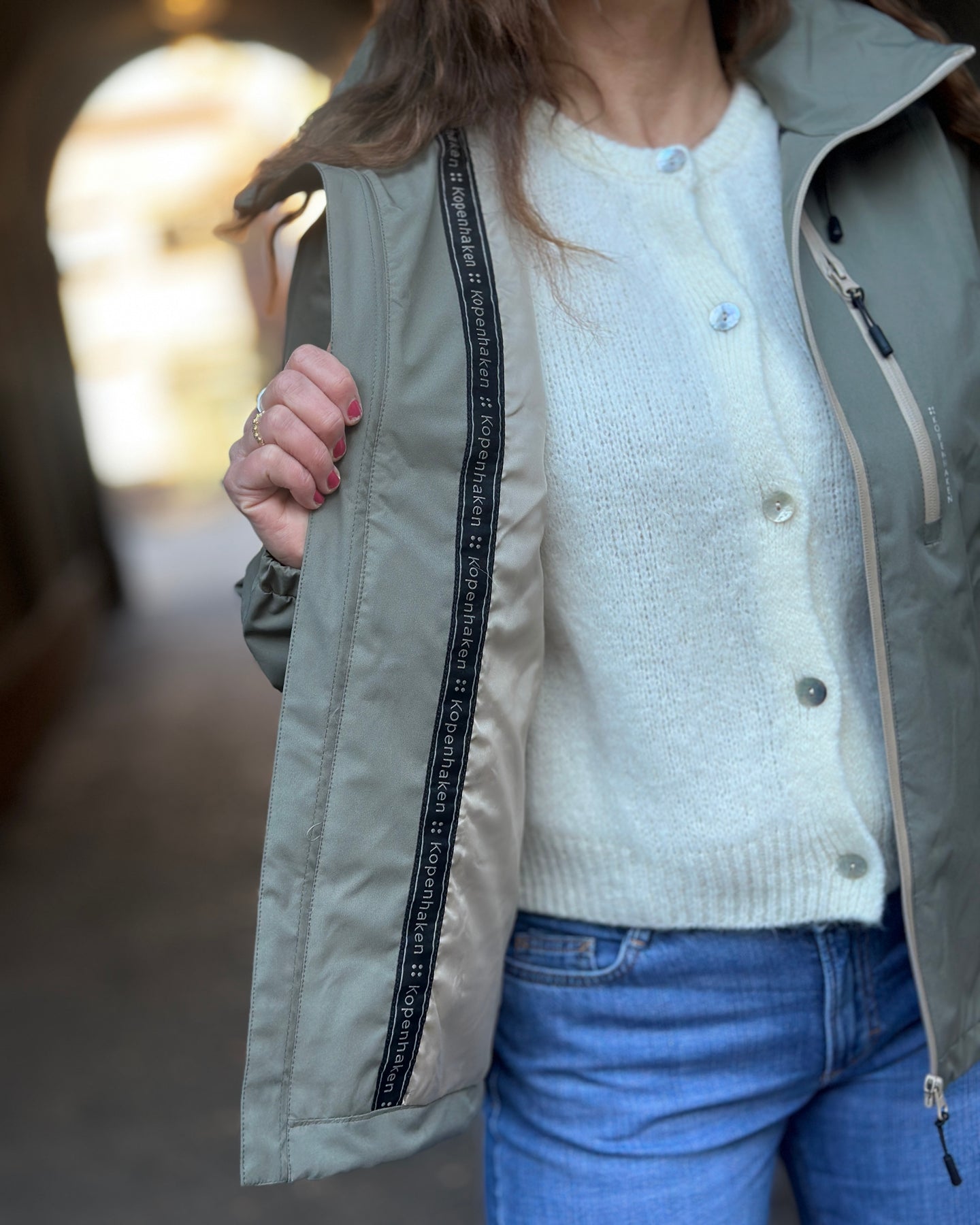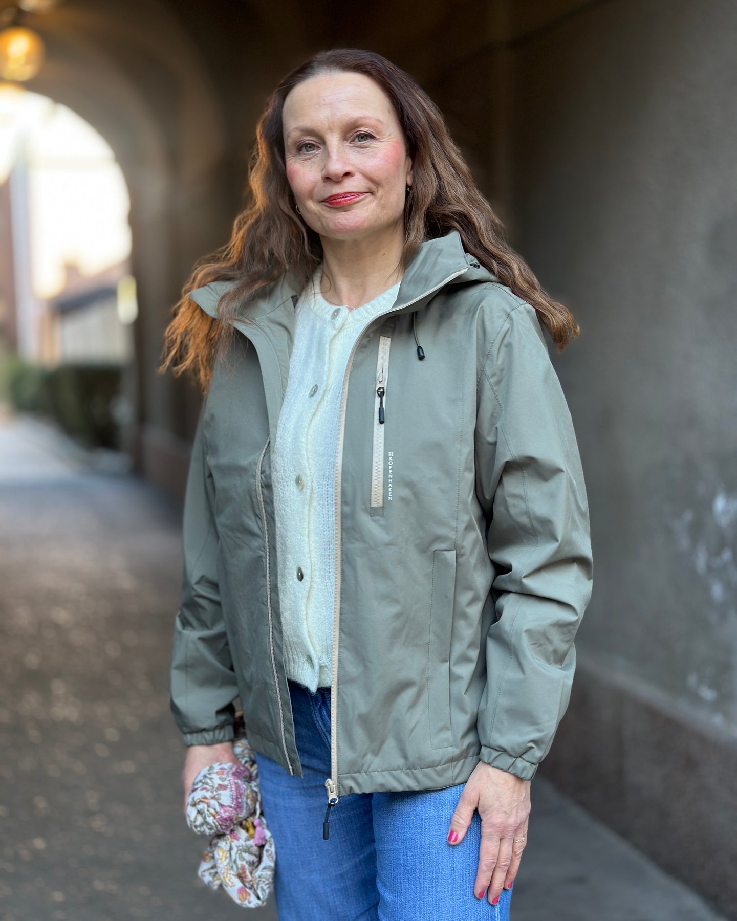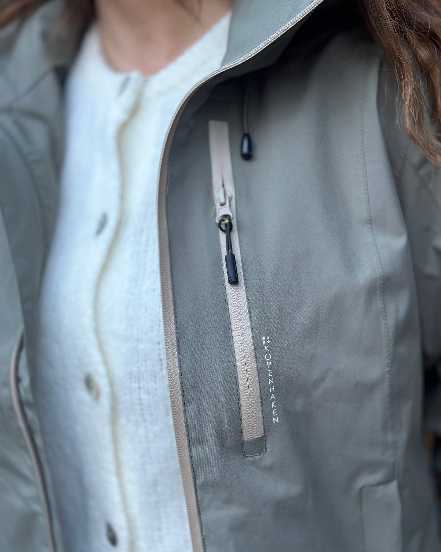Brystlommen med glidelås har teksten KØBENHAVN ved siden av seg, noe som gir jakken et særpreg. Den avtakbare hetten lar deg tilpasse jakken etter vær og anledning, mens de elastiske mansjettene sitter godt rundt håndleddene.