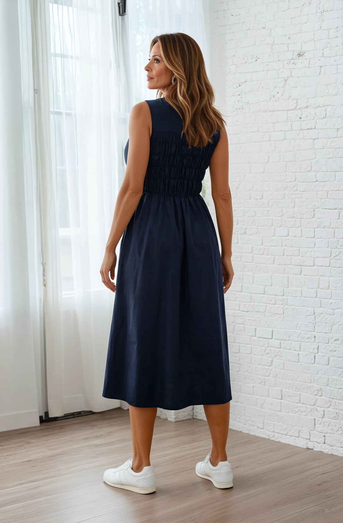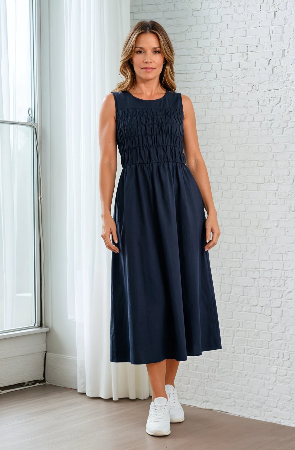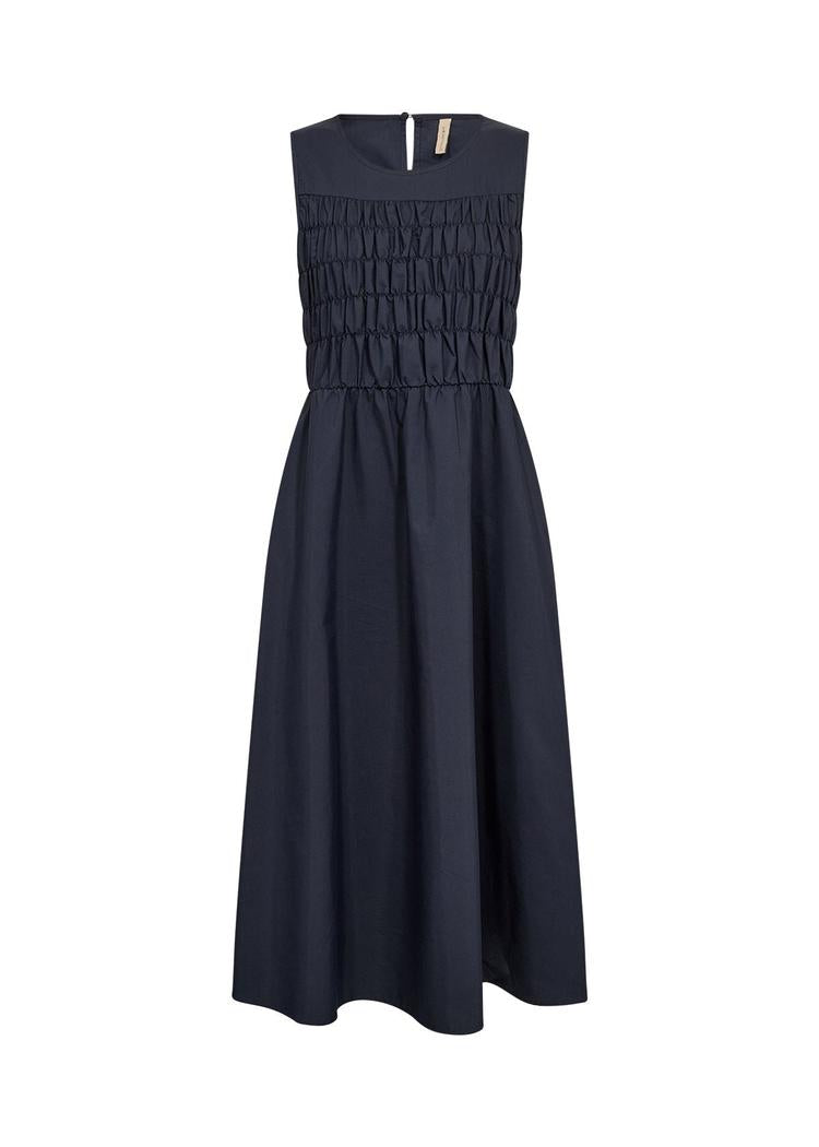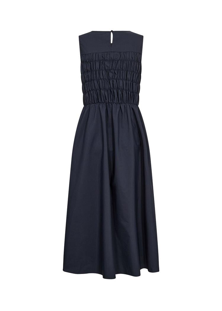Kjolen har en dyp marineblå farge som gir et rolig og tidløst uttrykk. Det ermeløse designet kombineres med en rynket overdel, mens den lange, flytende skjørtedelen gir bevegelsesfrihet og en avslappet silhuett.