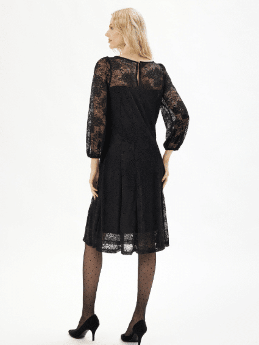 Svart kjole med blomsterblonder, lange ermer, knelang, sett bakfra.
