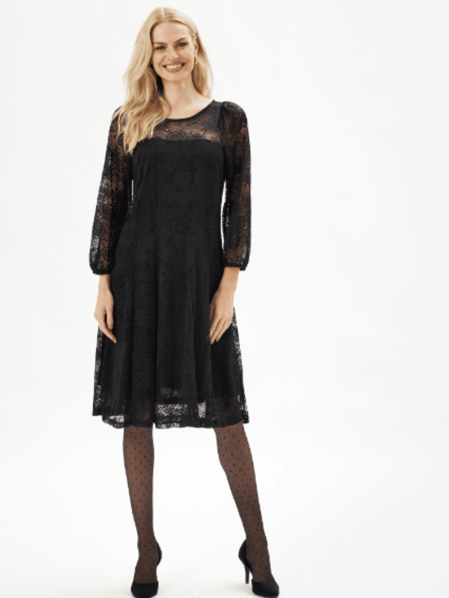 Svart kjole med blomstrete blonder, lange ermer og gjennomsiktig overlegg.
